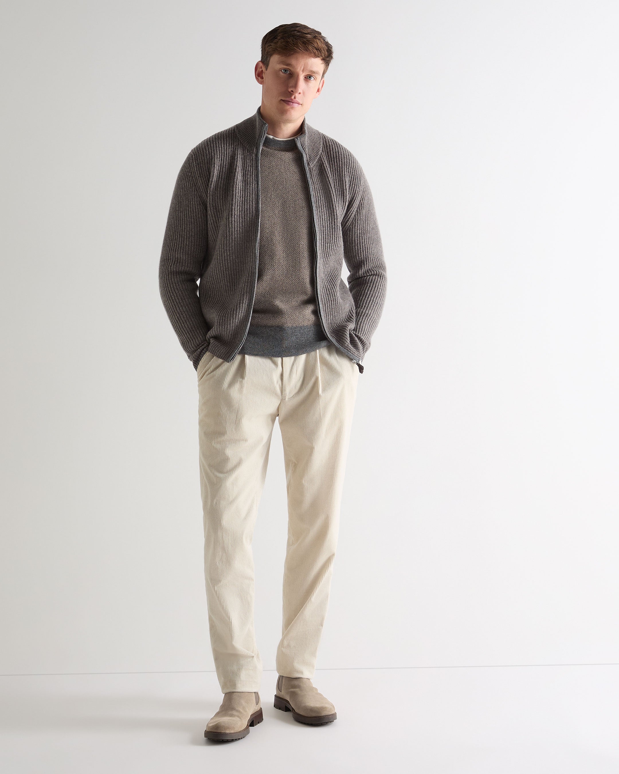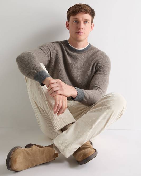 Crafted from 100% Mongolian cashmere, the Oxford round neck sweater is now knitted in a refined herringbone jacquard for subtle texture and timeless appeal. As worn by James Bond in Skyfall, this piece has become a sartorial icon - a versatile layer with enduring style that transitions effortlessly across seasons.