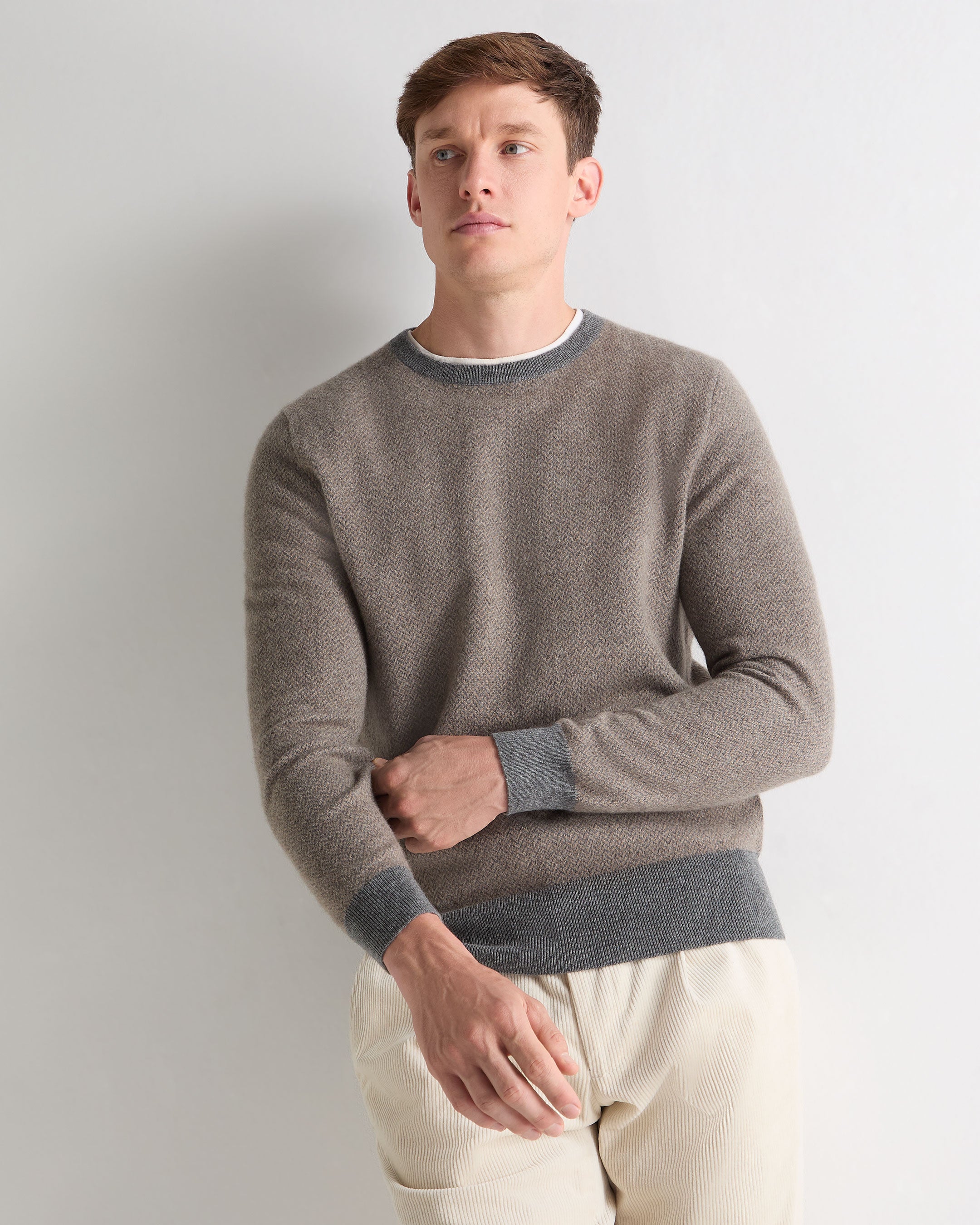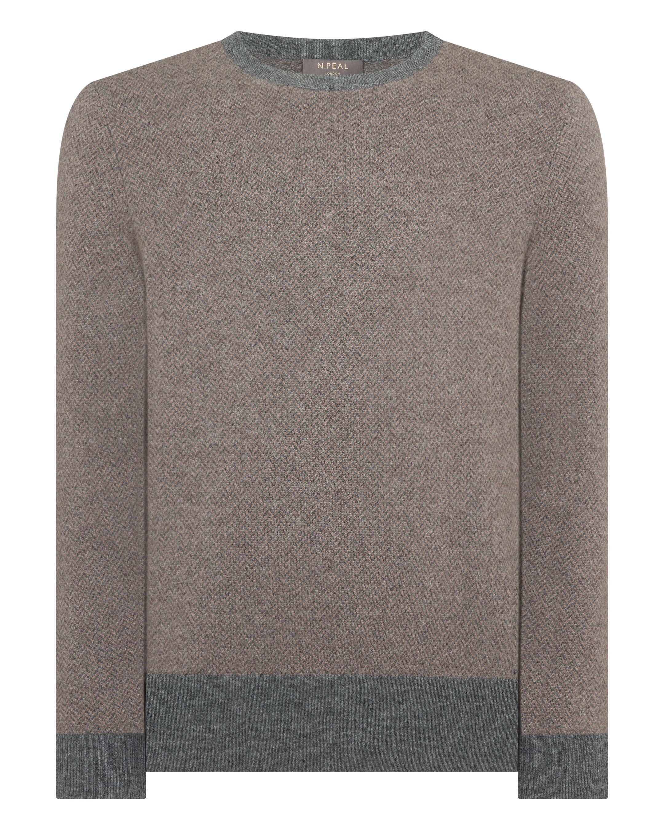 Men's Oxford Herringbone Round Neck Cashmere Jumper In Otter Brown
