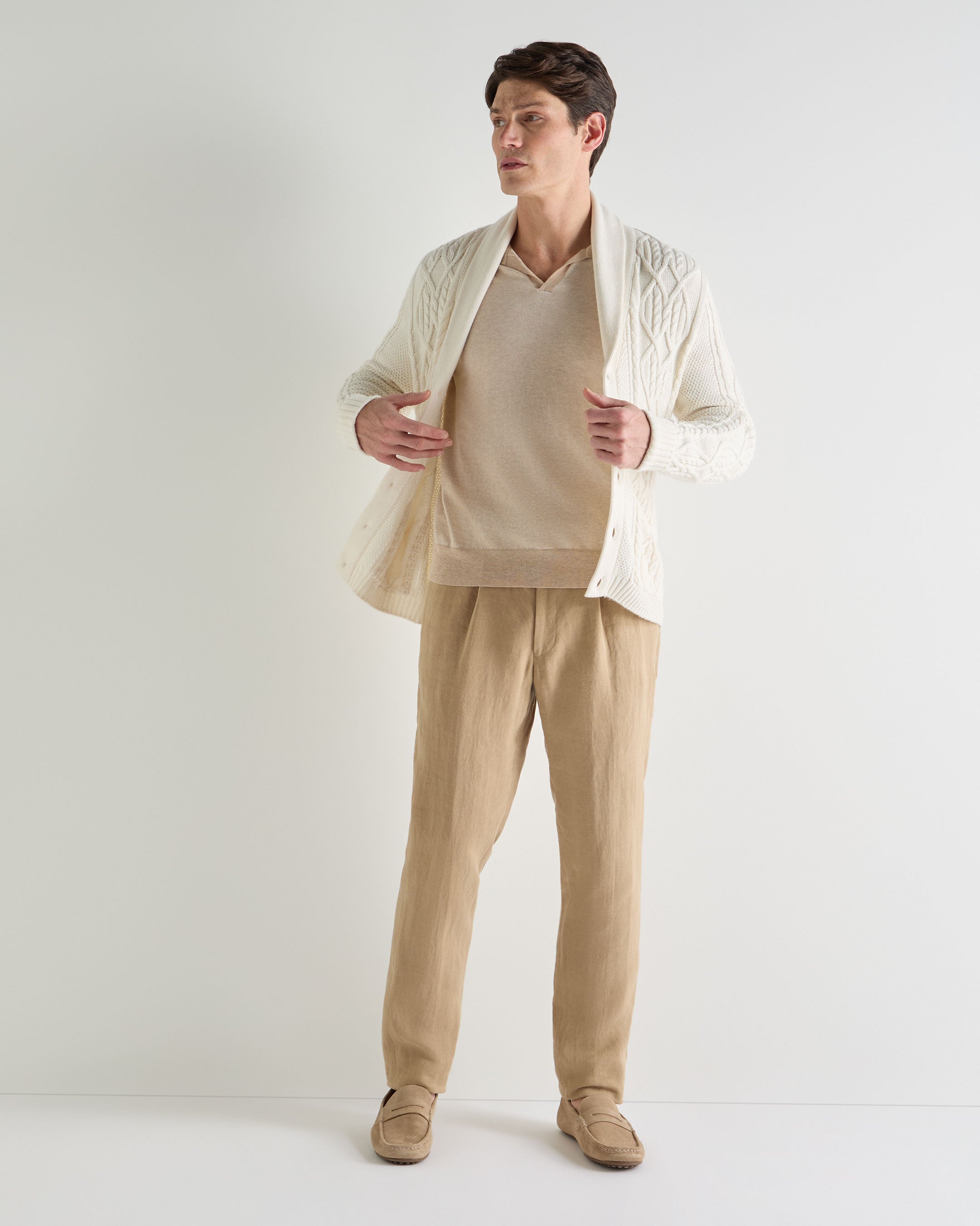 An elevated take on the polo-neck top, designed for warm-weather travel and days that unfold effortlessly. Rendered in a subtle birdseye jacquard, it brings depth and texture to a clean silhouette — equally at ease for early meetings, long lunches and evenings by the coast, travelling seamlessly from city streets to shoreline escapes.