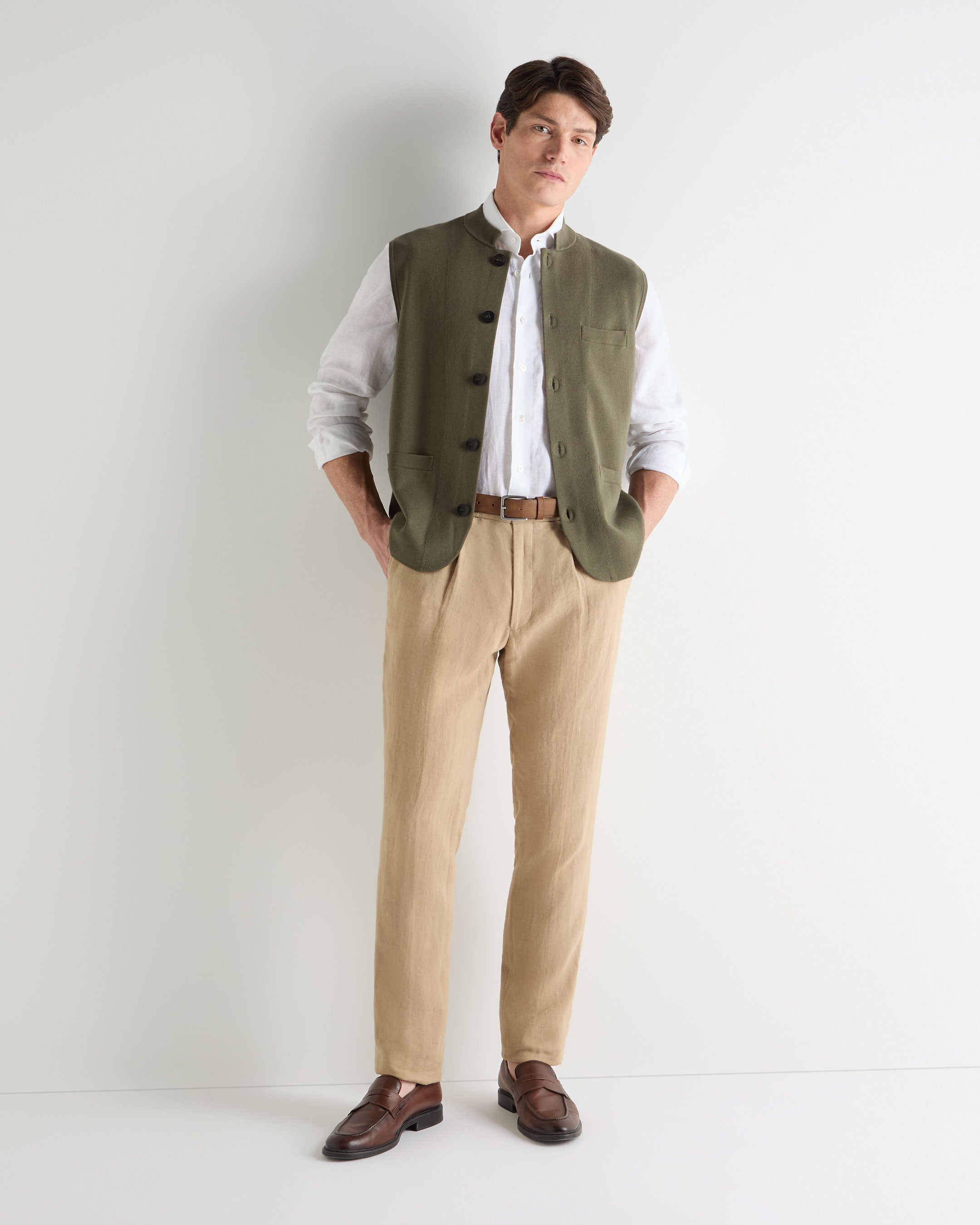 A refined layering piece designed for warm-weather dressing, this gilet brings structure and ease to summer looks. Cleanly tailored with a Nehru collar, it’s ideal for travel days and evenings that call for polish without formality.