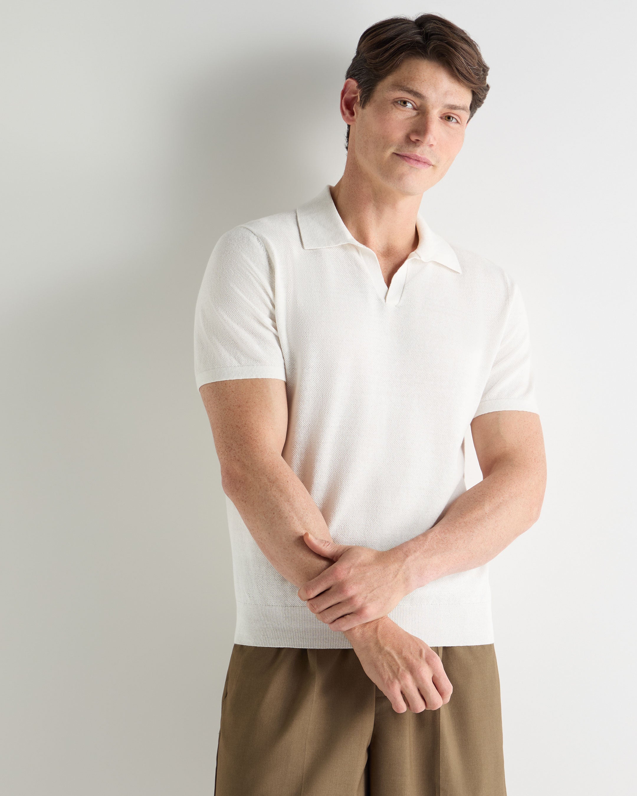 A warm-weather staple refined through fabric and proportion, this piqué polo is designed for days that move easily from city mornings to unhurried afternoons away. Clean, confident and quietly elevated, it delivers the kind of ease that travels well — polished enough for lunch plans, relaxed enough for long days on the move.