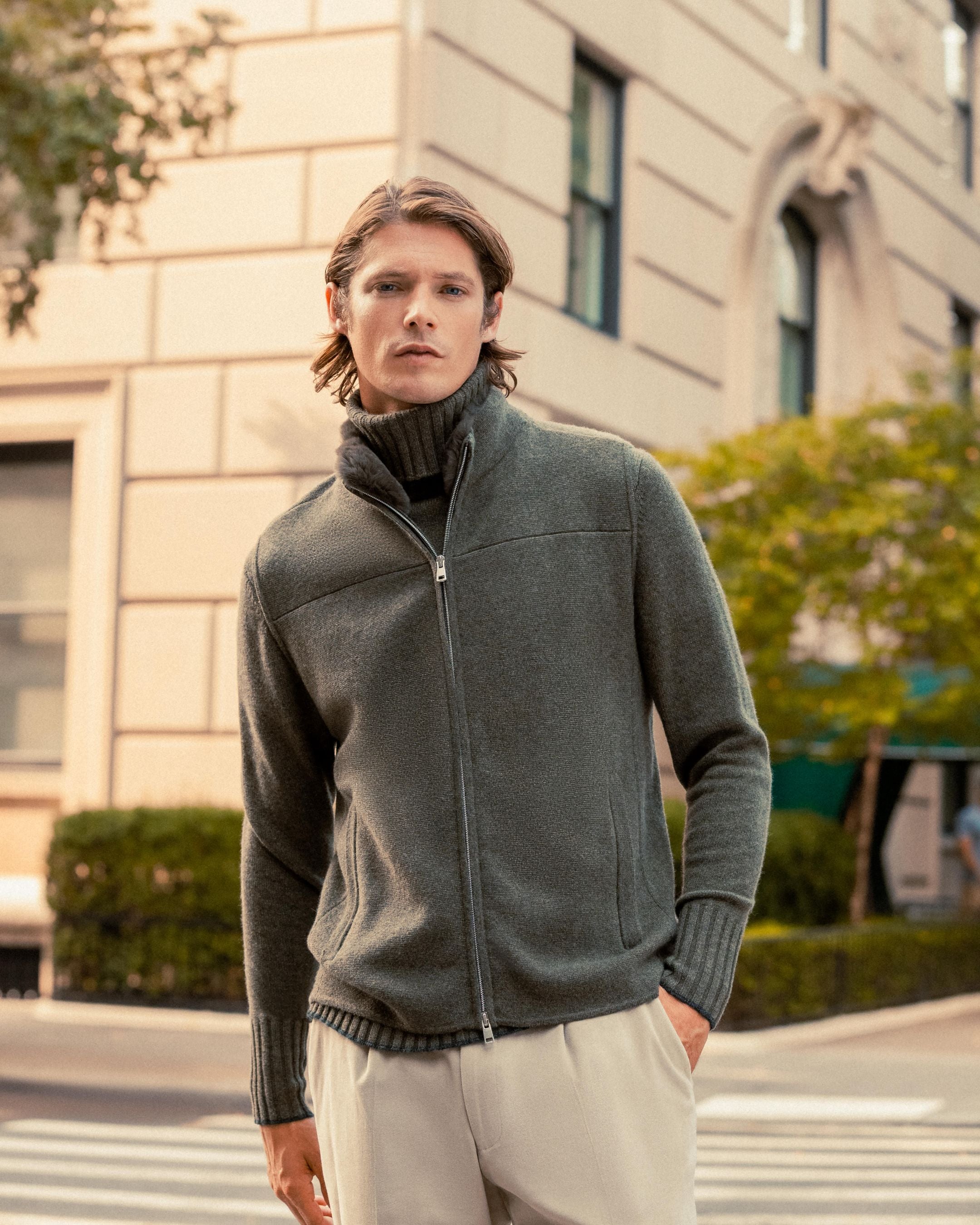 - The collar features a luxurious dark olive rex fur trim