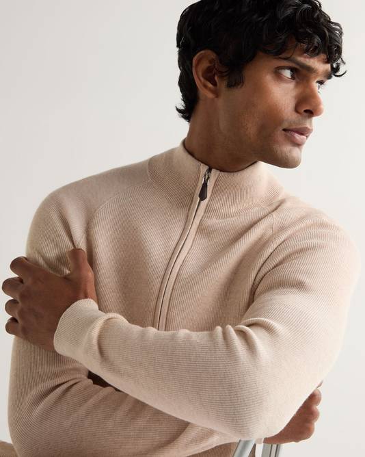 Men's Ribbed Full Zip Cotton Cashmere Jumper In Sandstone Brown