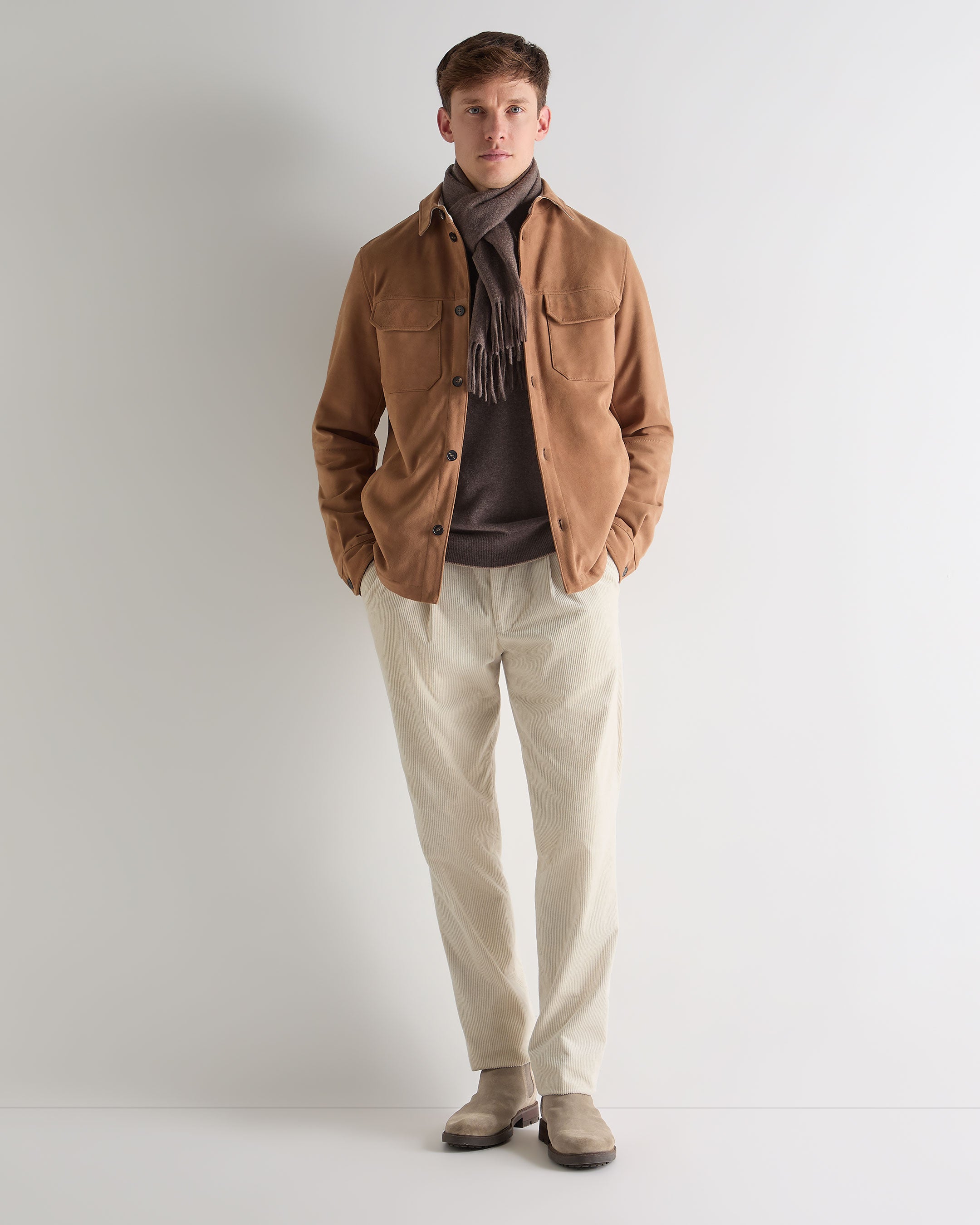 Cut from the most luxurious 100% suede leather, this N.Peal overshirt-style jacket brings clean lines and refined ease to transitional layering. Chest flap pockets and tonal buttons lend a utility-inspired touch, while the softest suede finish elevates the jacket into a far more considered piece. Wear this garment buttoned over a shirt or layered open with a T-shirt for the ultimate in relaxed sophistication.
