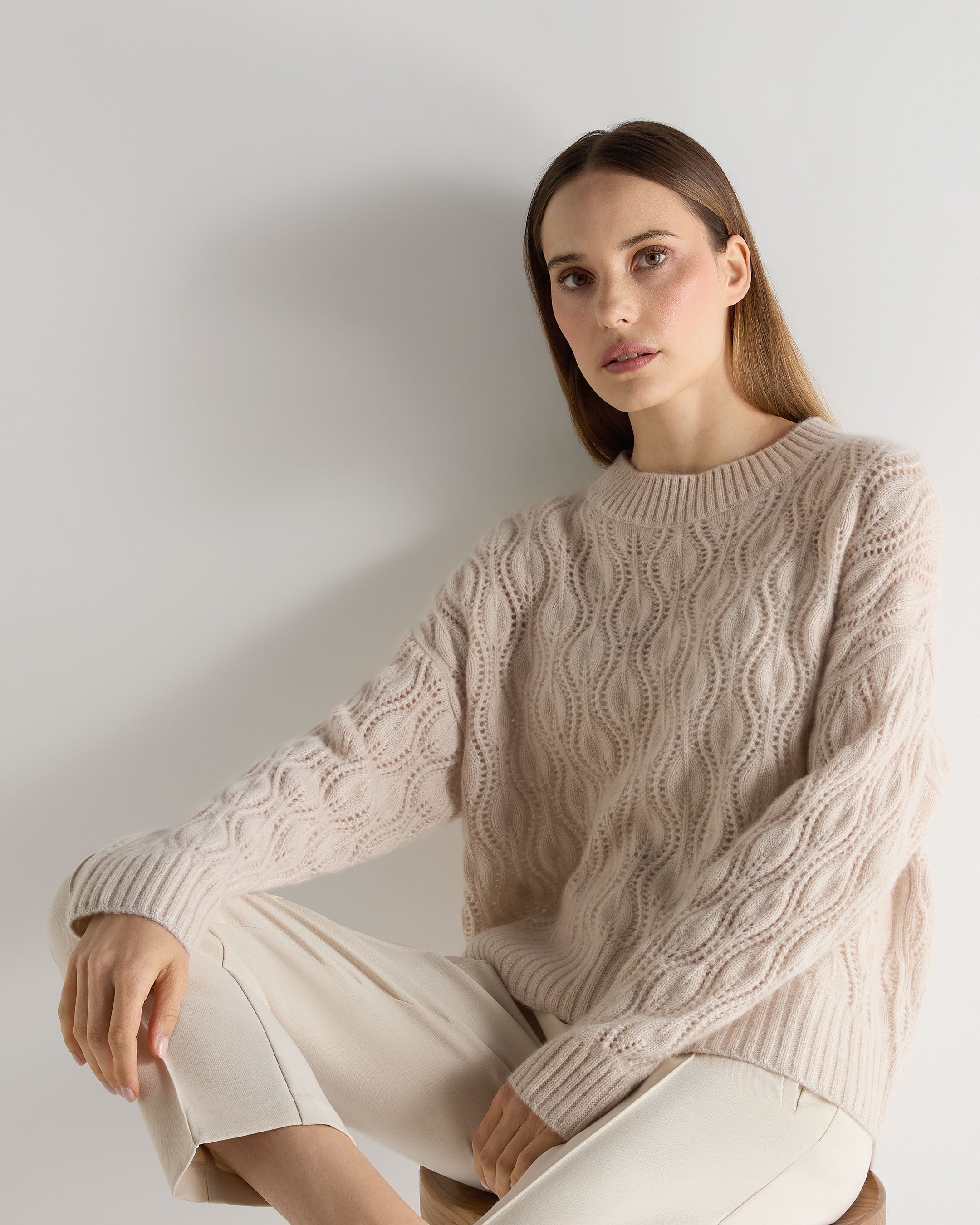 This gloriously chunky N.Peal cashmere sweater is crafted in an intricate lace stitch that lends depth and femininity to a classic N.Peal silhouette. Woven with the slightest hint of understated sparkle at the hem and cuffs, it brings a refined touch to cooler days. The plush 3-ply knit offers enveloping warmth and luxury, while ribbed trims provide structure - ideal for layering from crisp mornings to candlelit evenings.