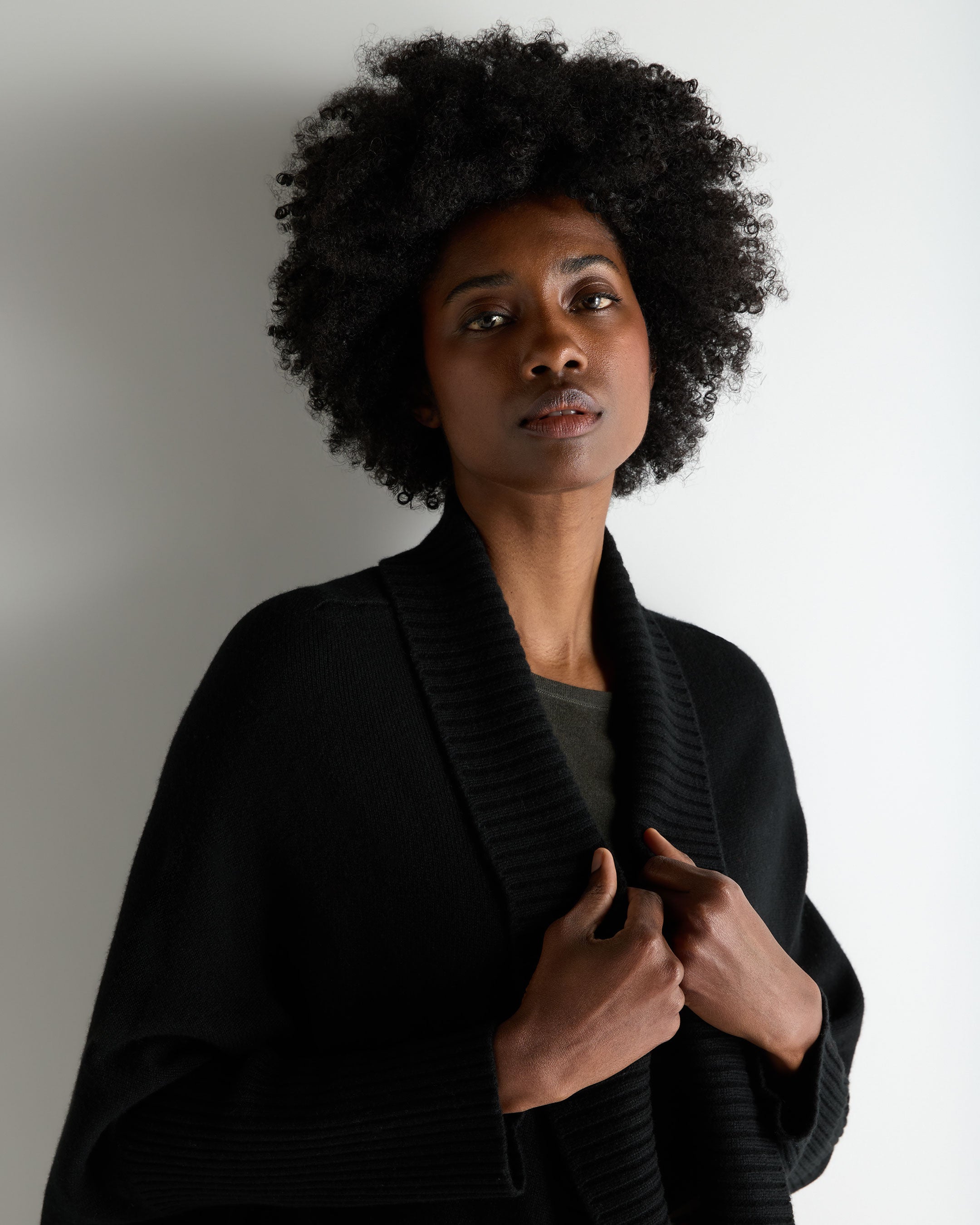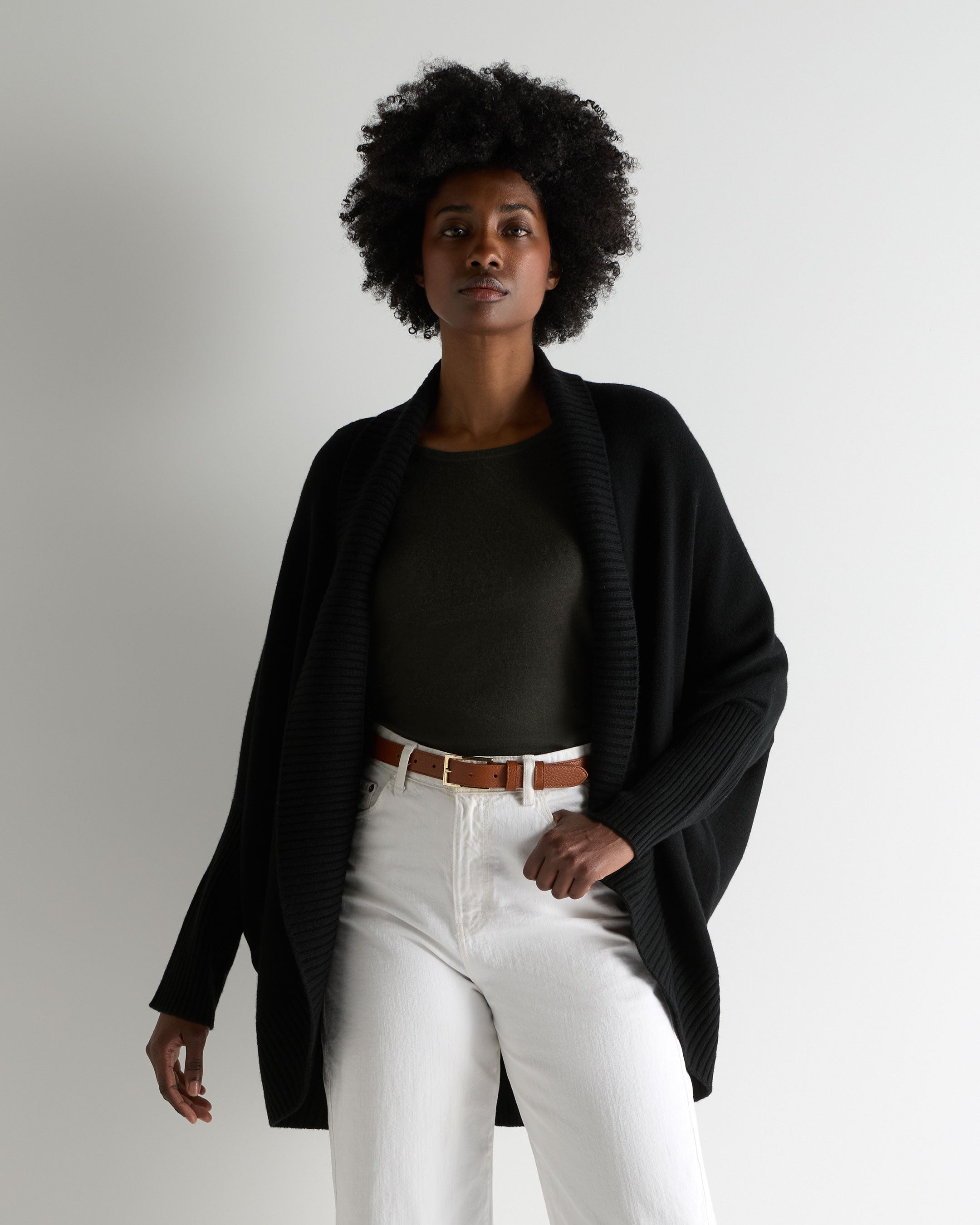 – Open-front design allows for fluid styling, finished with ribbed cuffs and hem for subtle structure