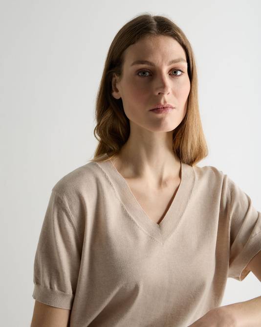 A refined staple for warm-weather dressing, this V-neck top is designed to bring quiet polish to everyday moments. Clean in line and effortless in feel, it is the kind of piece that travels easily — equally suited to mornings on the move, relaxed afternoons and evenings that unfold without plan.