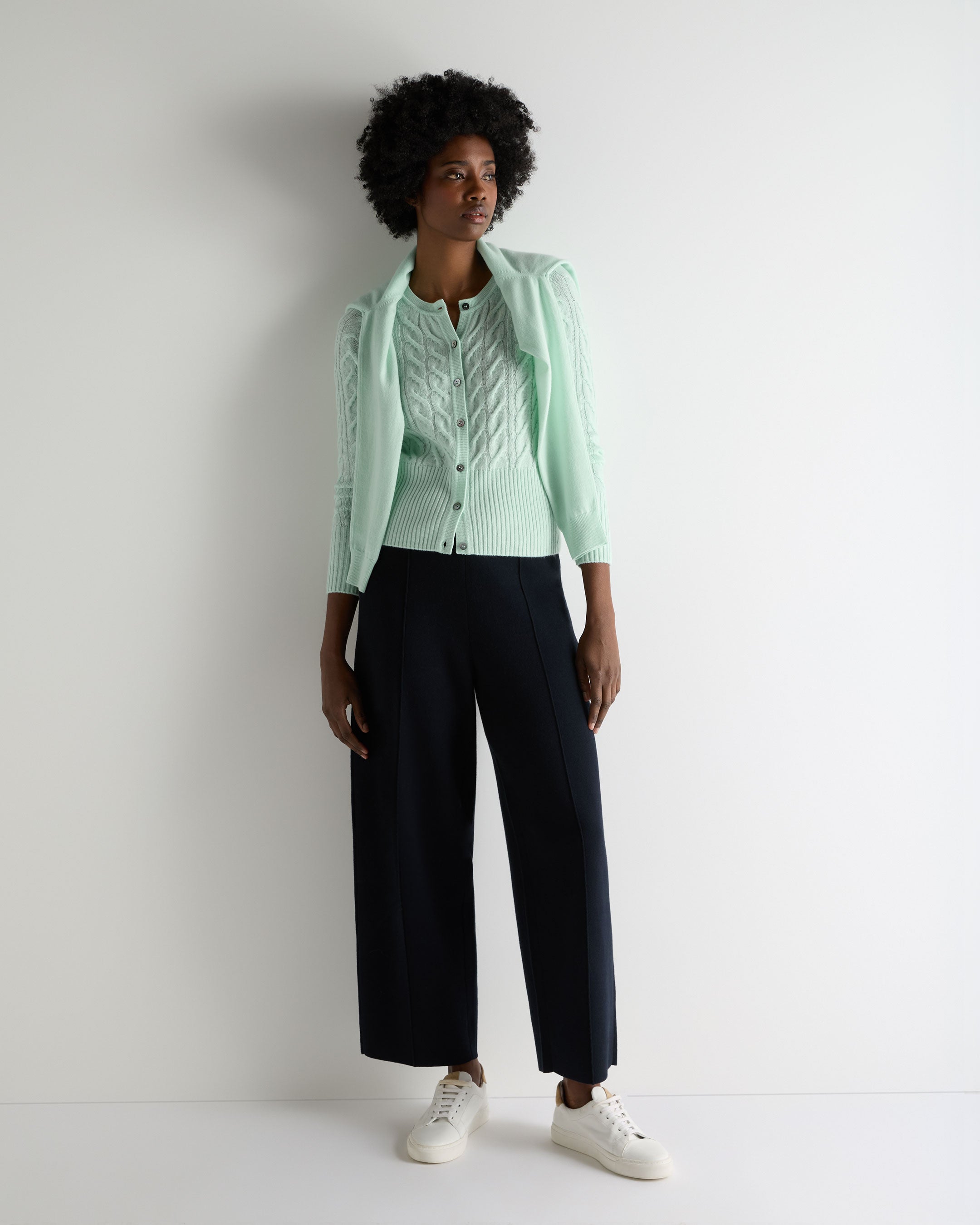 A refined take on a classic, this cable-knit round-neck cardigan brings a sense of understated luxury to everyday dressing. Its sculpted texture and beautifully soft handle make it the perfect layer for transitioning between seasons — polished enough for city days, relaxed enough for weekends away.