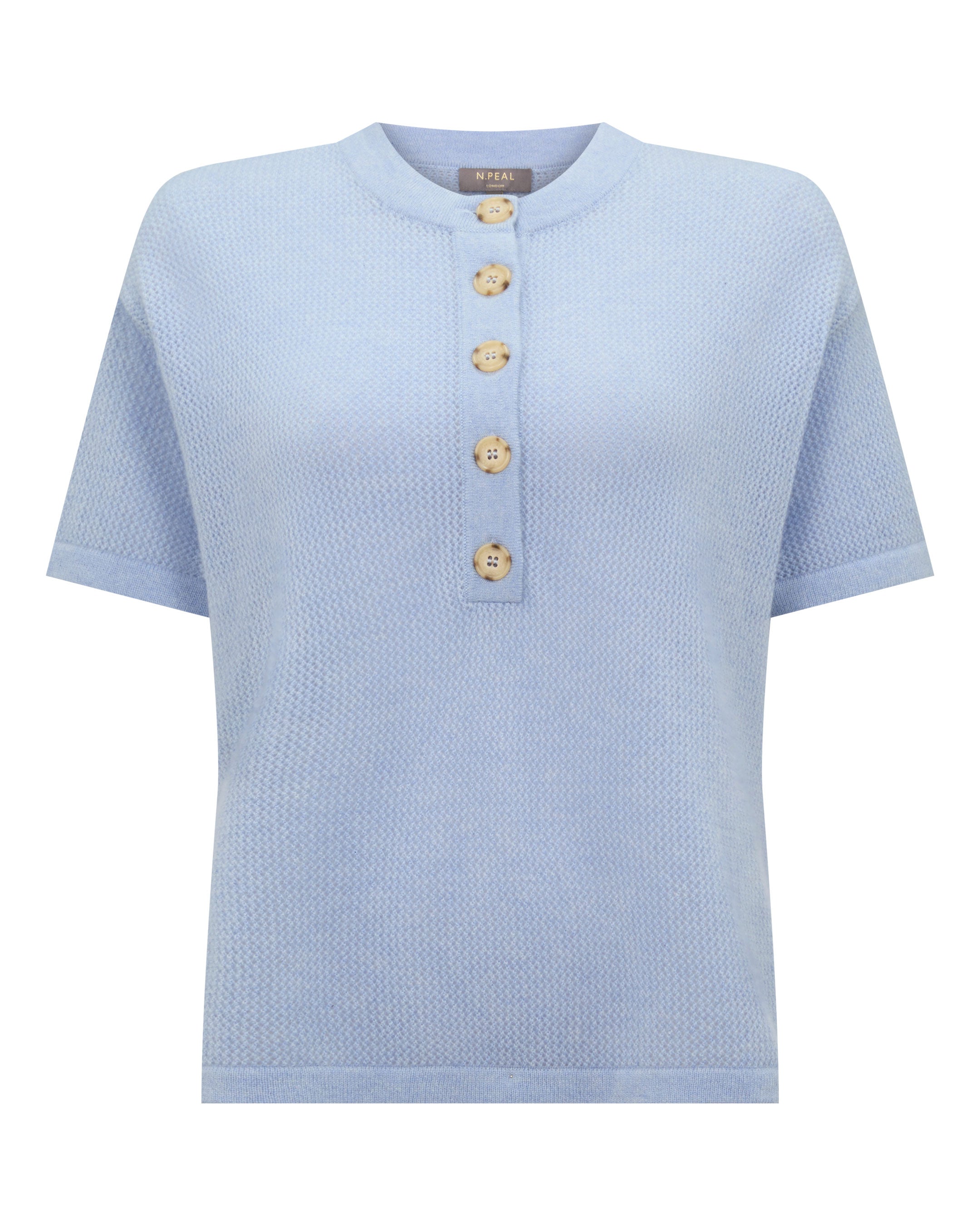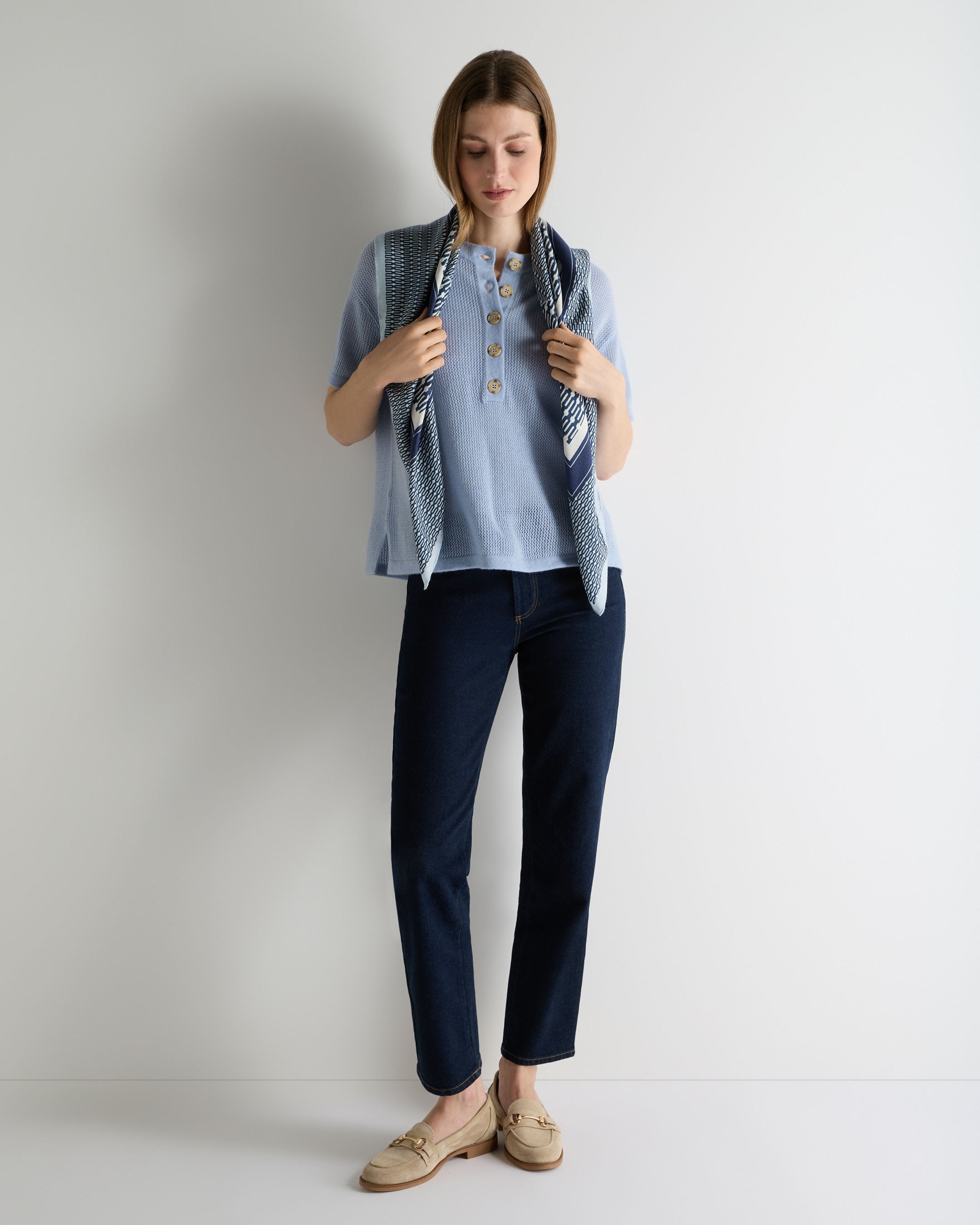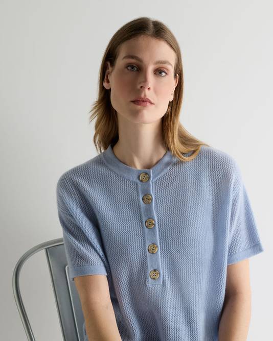 – Finished with a short button placket and classic shell buttons, adding a discreet point of detail at the neckline