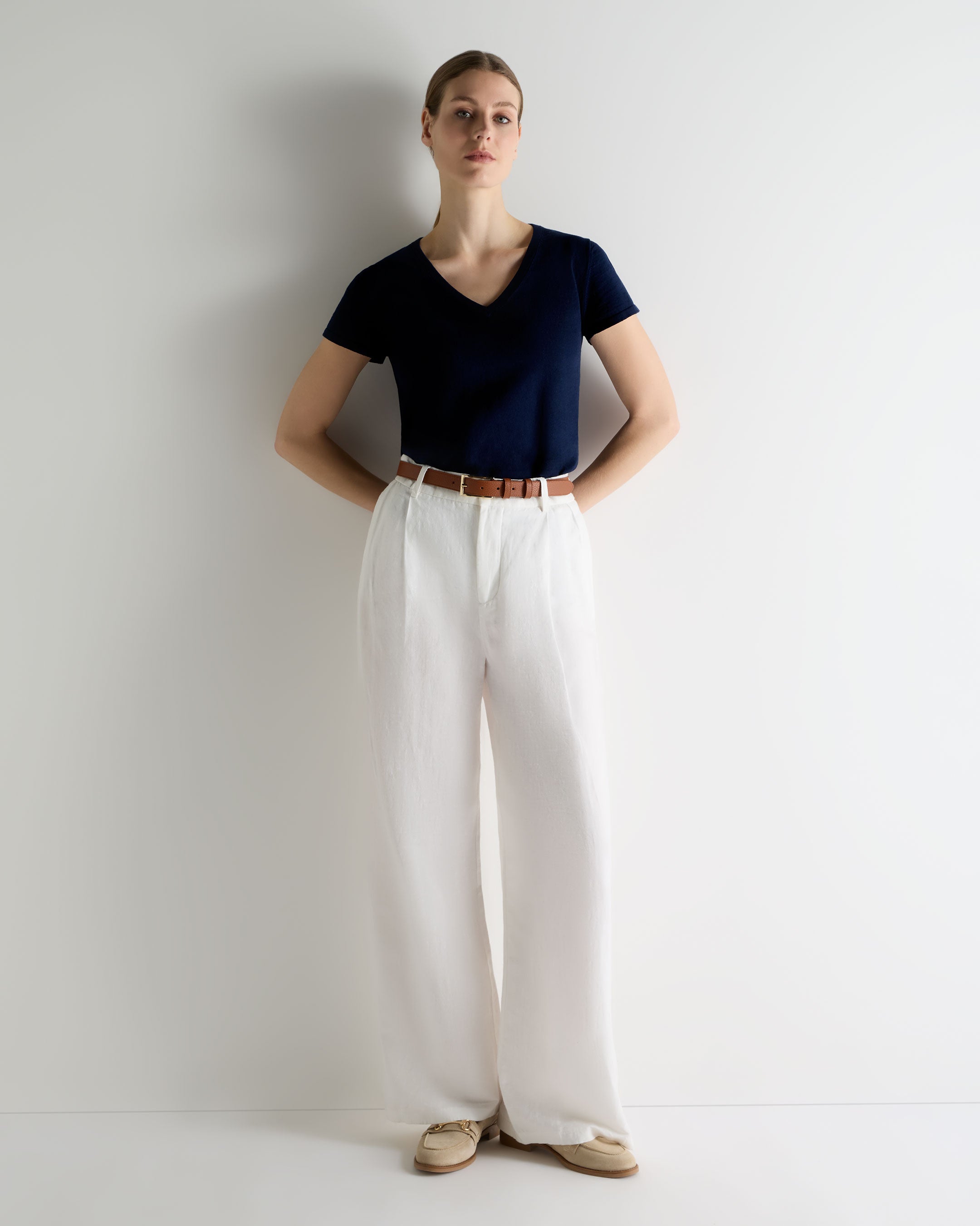 A refined essential designed for warm-weather ease, this linen-blend top brings a light, confident polish to everyday dressing. Cut with a clean V-neck and short sleeves, it’s the kind of piece that slips effortlessly into life on the move — ideal for travel days, long lunches and unhurried moments between destinations.