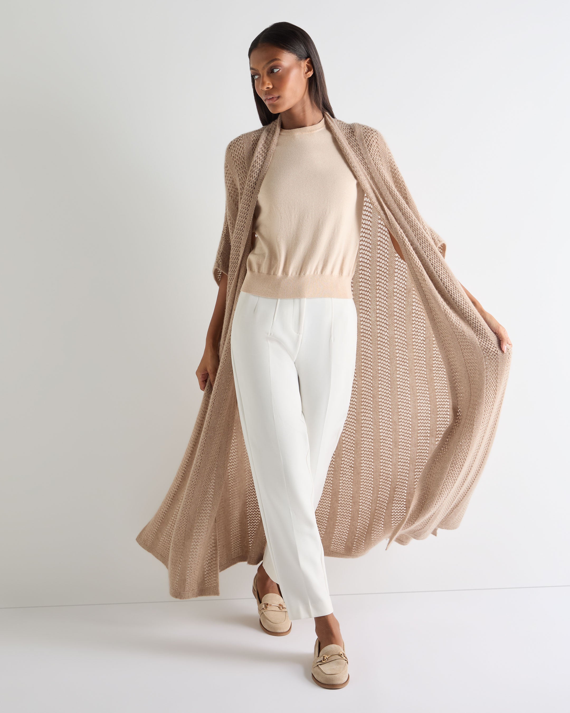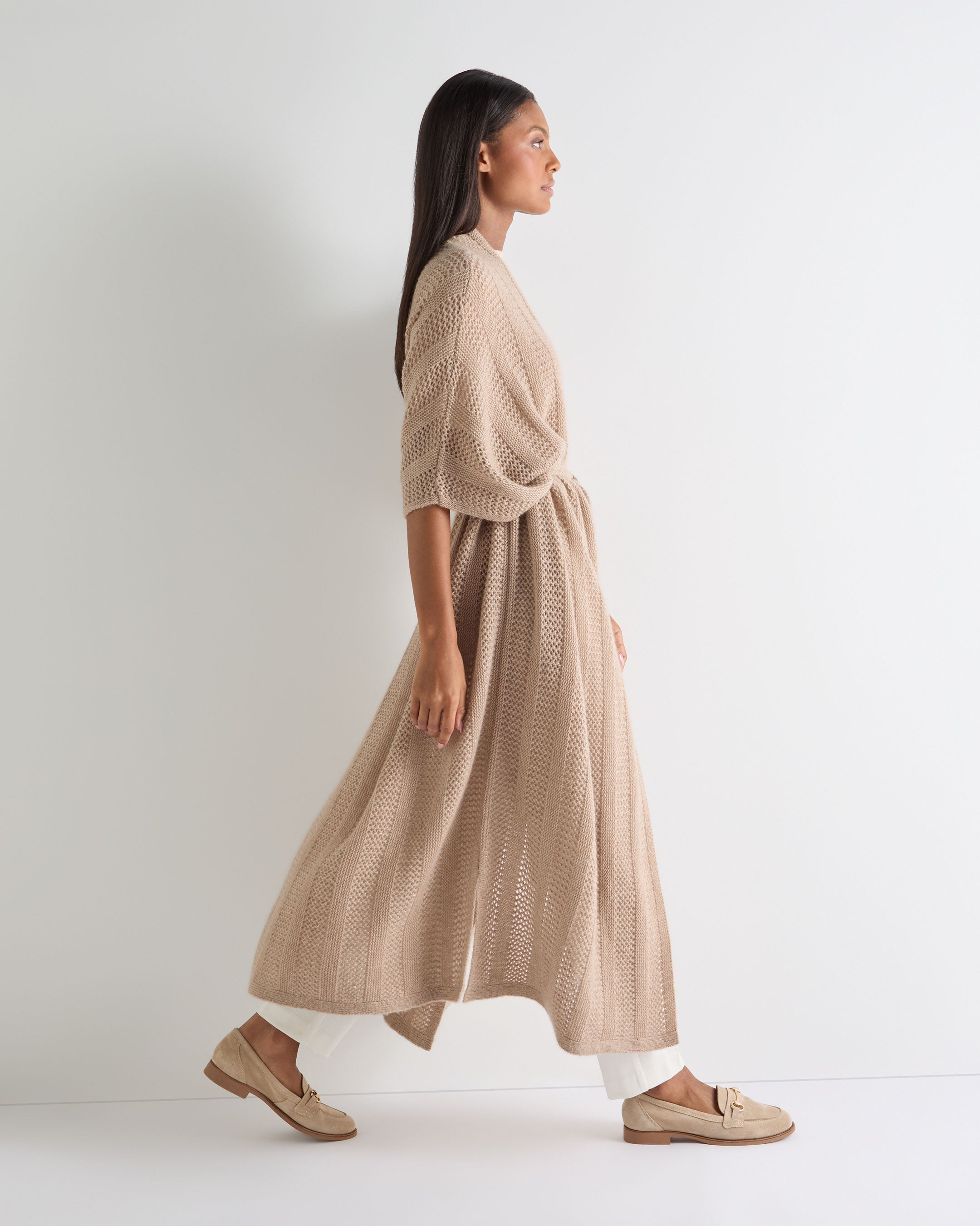 An elegant layer that moves with ease, this open-stitch cardigan is designed for unhurried days and moments of escape. Fluid in silhouette and generous in scale, it slips effortlessly over summer looks — equally at home on relaxed travel days, coastal walks or evenings that call for something quietly considered.